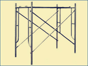 門式鋼管腳手架是用普通鋼管材料制成工具式標準件,在施工現場組合而成。其基本單元是由一副門式框架、二副剪刀撐、一副水平梁架和四個連接器組合而成。若干基本單元通過連接器在豎向疊加,扣上臂扣,組成一個多層框架。在水平方向,用加固桿和水平梁架使相鄰單元連成整體,加上斜梯、欄桿柱和橫桿組成上下步相通的外腳手架。